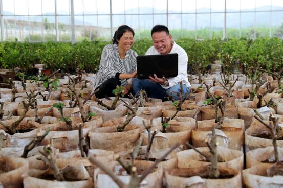 江西省抚州市东乡区在互联网与农产品销售中寻找契合点、突破口,依靠网络科技力量为农户打开致富新路。果农在接到网上无花果盆景订单后,喜笑颜开。